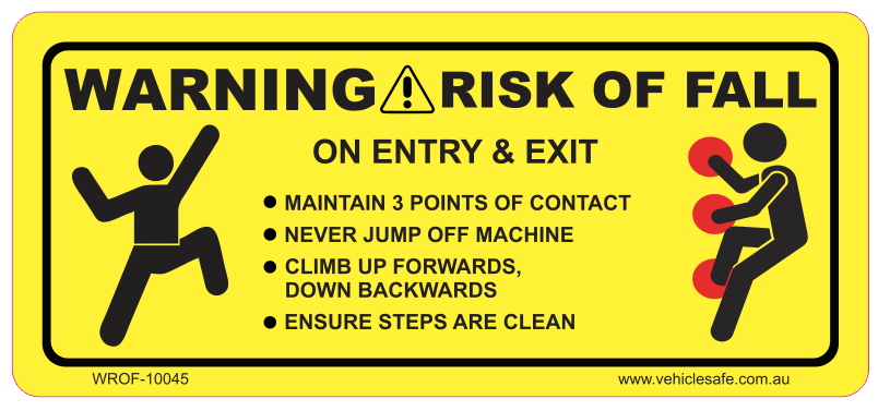 Ideal for construction vehicles, equipment, industrial machinery, and transport vehicles, this decal clearly identifies there is a Risk of falling and to maintain 3 points of contact at all times, Promoting Safety and reducing risk on site.